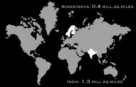 The traditional map distorts the world to the advantage of the countries in which white people predominate. Though Scandinavia appears to be larger than India, India is actually about three times larger.
